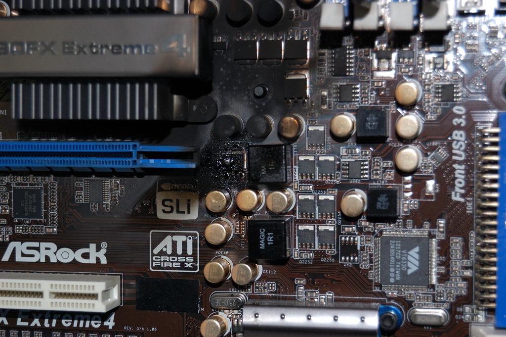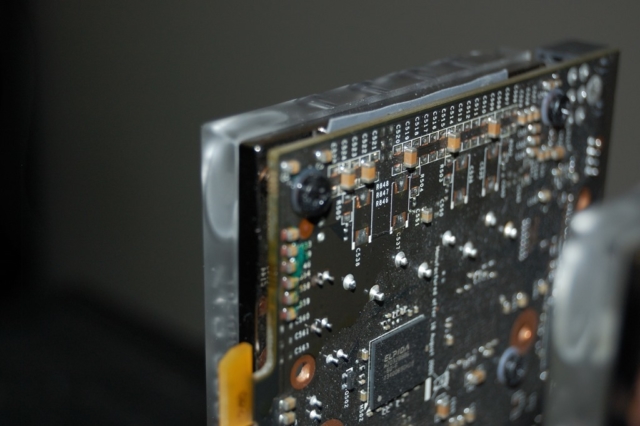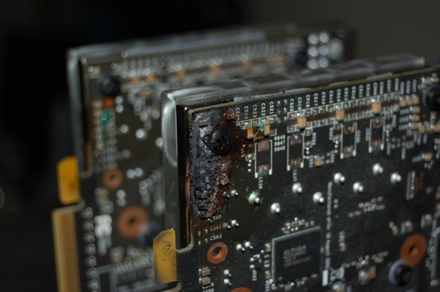 Under the graphics cards was a horror story as well, as you can tell by the above pictures. This is what happens when you mix flames with PCBs. The fact several of the electricity-regulating components got fried, literally, led me to declare all the singed components to be a total loss.