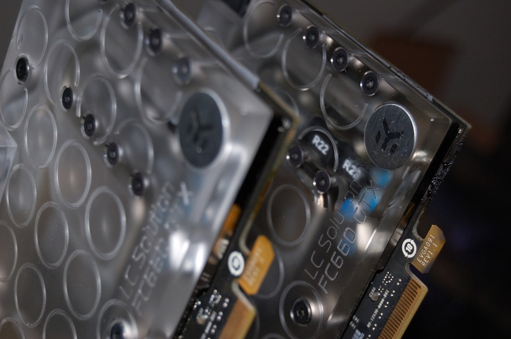 Once I was sure nothing was going to flare up, my first move was to drain the loop – that all-important drainage system I made sure to install and test comes in handy yet again. Then it was a matter of pulling things out, starting with the graphics cards. Things didn’t look good.