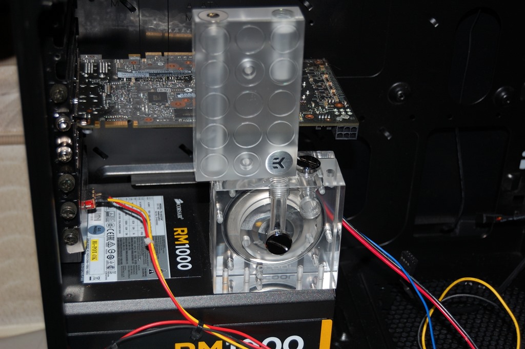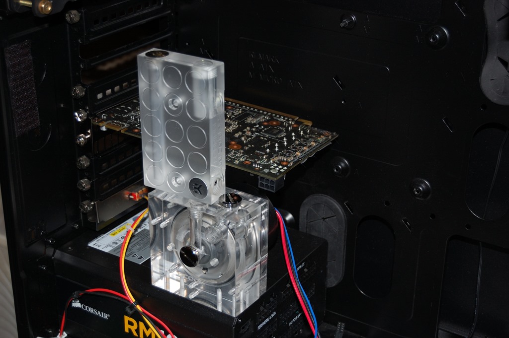 I had planned to have the pump sitting on top of the power supply directly below the graphics cards. Unfortunately the pump and SLI bridge are going to be much closer together than I originally thought. As in, they’ll be millimeters apart instead of further apart as I’d hoped.