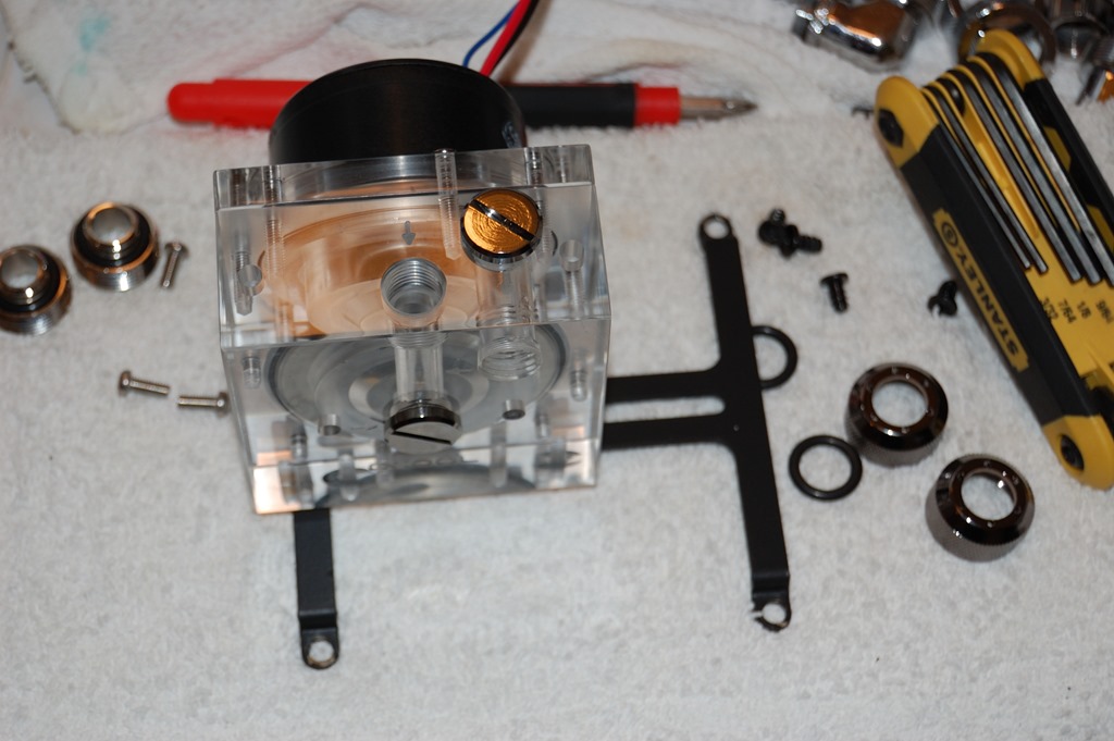Now, granted this still has the potential to work, if I can get a fitting to line up the outlet of the pump directly to the inlet on the SLI block. I’d be able to determine that when the order arrived, as I included a Swiftech 90-degree single rotary fitting in the order. And the SLI block will probably be just a little higher such that a direct line-up from the pump outlet to SLI inlet could be pretty spot on.