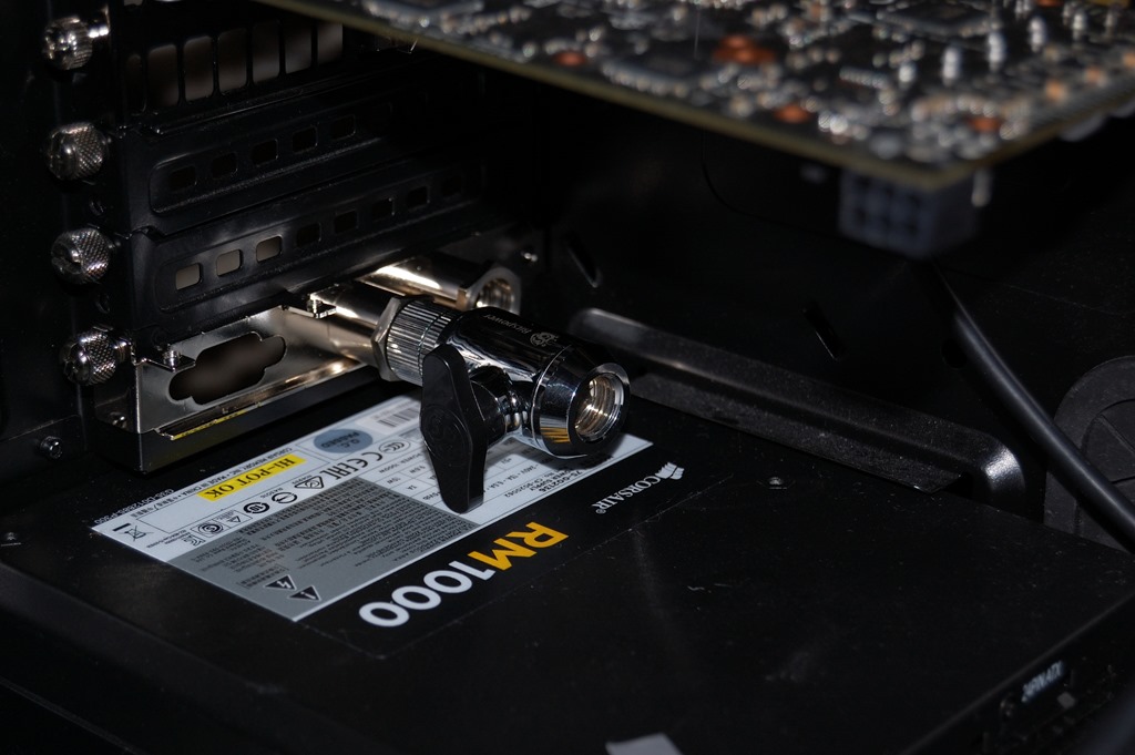 Now the drainage system – something you always need to plan for in a loop – is going through the Koolance pass-through bracket with a Bitspower valve. A t-fitting will divide the flow from the inlet to the SLI bridge and direct part of the flow to the valve. Draining the loop will basically be putting a barb fitting on the outlet, open the valve and tilt. Now this isn’t the lowest point in the loop – that would be the pump – but it’s the easiest place to put the drain valve.