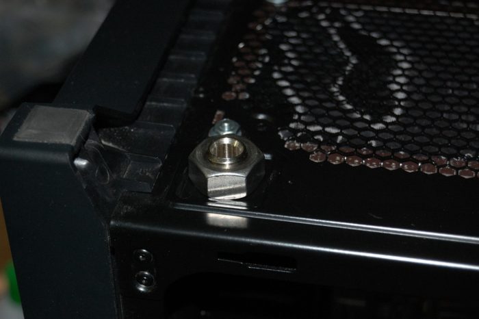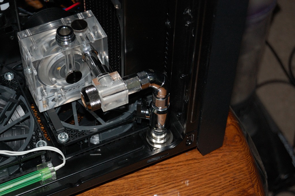 But after getting the bulkhead fitting installed, I used fittings to create the drain system off the Primochill fitting. I have a Swiftech dual SLI fitting that extends off the pump’s outlet to the Primochill fitting. To the left looking directly at it is the Primochill hardline fitting. To the right, the flow goes through a Swiftech extension fitting, Swiftech 90-degree dual rotary fitting, down to a Swiftech single-slot SLI fitting, into the Bitspower valve, which connects to the Koolance bulkhead fitting via an Alphacool male-to-male rotary fitting.