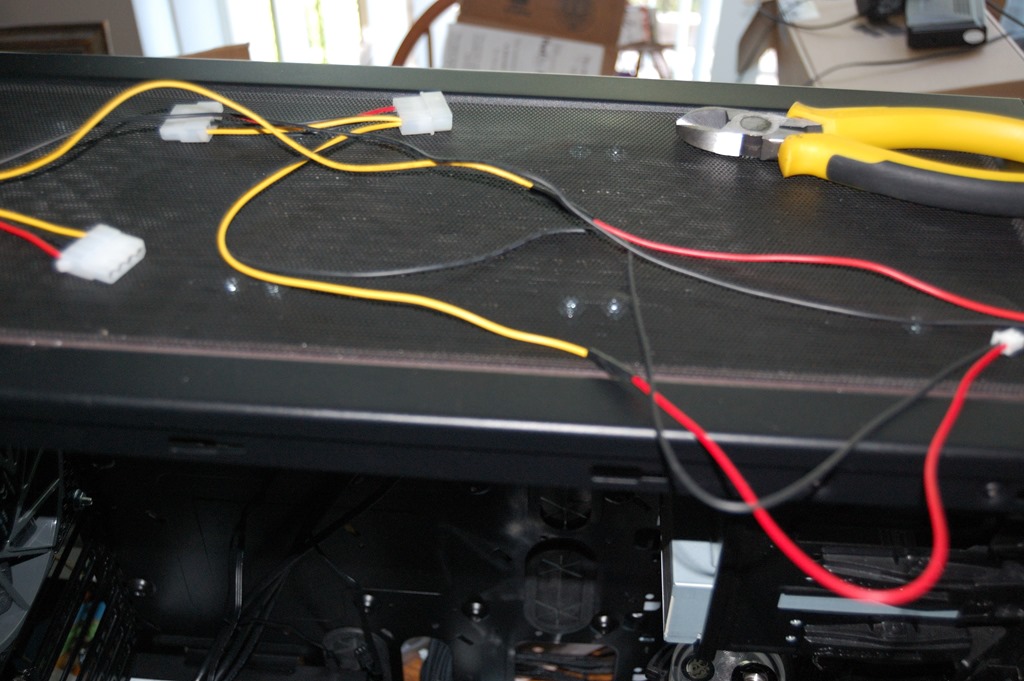 Simple mod, really. Snip the red and yellow wires first about halfway between the switch and Molex power connector. This should give you red and white wires that are more or less the same length. Then strip the ends and join them together. I just hooked the ends around each other and secured with electrical tape – it looks crude but they’ll be behind the mainboard tray and out of sight anyway. If these were going to be visible in any way, I would’ve tried to find a better way to do this.