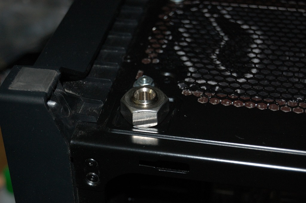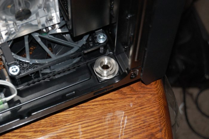 The drain port was my first move. I knew I needed to cut a hole in the bottom for it, but how was the question. I tried Dremel blades at first and they didn’t do jack on that mark. So I paid the $20 for a step bit, which did the job nicely, though it left nice little aluminum shards all over the place, but that’s what a vacuum is for. The step bit I bought only goes up to 1/2″, which is just under the 14mm that would allow a clean pass-through. But I was able to thread the fitting through till I could secure it with the nut on the other side.