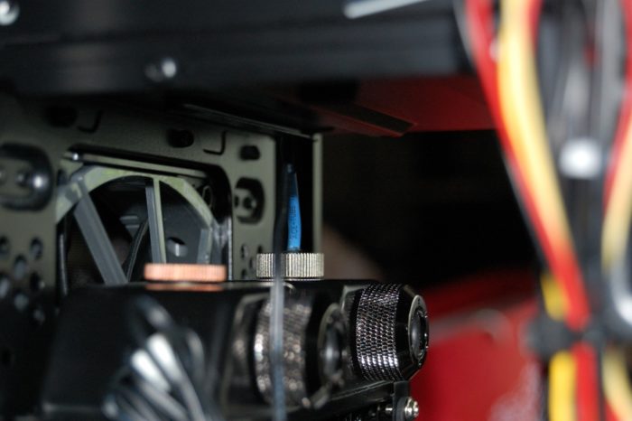 With the cable management, I started with plugging the fans into the fan controller and tying up as much of the cabling as possible into some 3M Command cable clips I’d previously installed into her case when I did the initial power supply upgrade. Zip ties helped keep everything together within the clips. Speaking of power supply, getting the power supply cables installed was the next step – I wanted them in before I started installing components just to make things a little easier. I also installed the Koolance temperature sensor in one of the ports on what will be the outflow of the radiator.