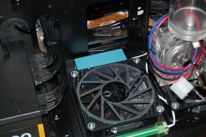 Then I turned my attention to placing the inverters for the CCFLs. One is sitting conveniently behind the mainboard tray, while the other is behind the bottom 120mm fan closest to the power supply, which will be behind the hard drive mount when that is reinstalled, meaning the inverter will be completely hidden from sight. Both are held in place by 3M VHB tape.