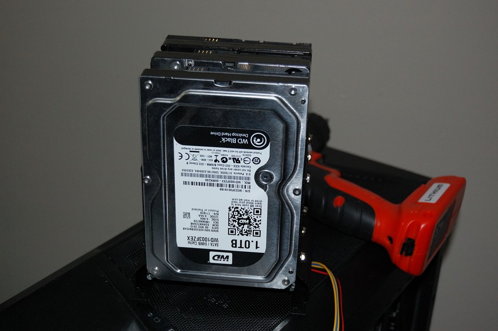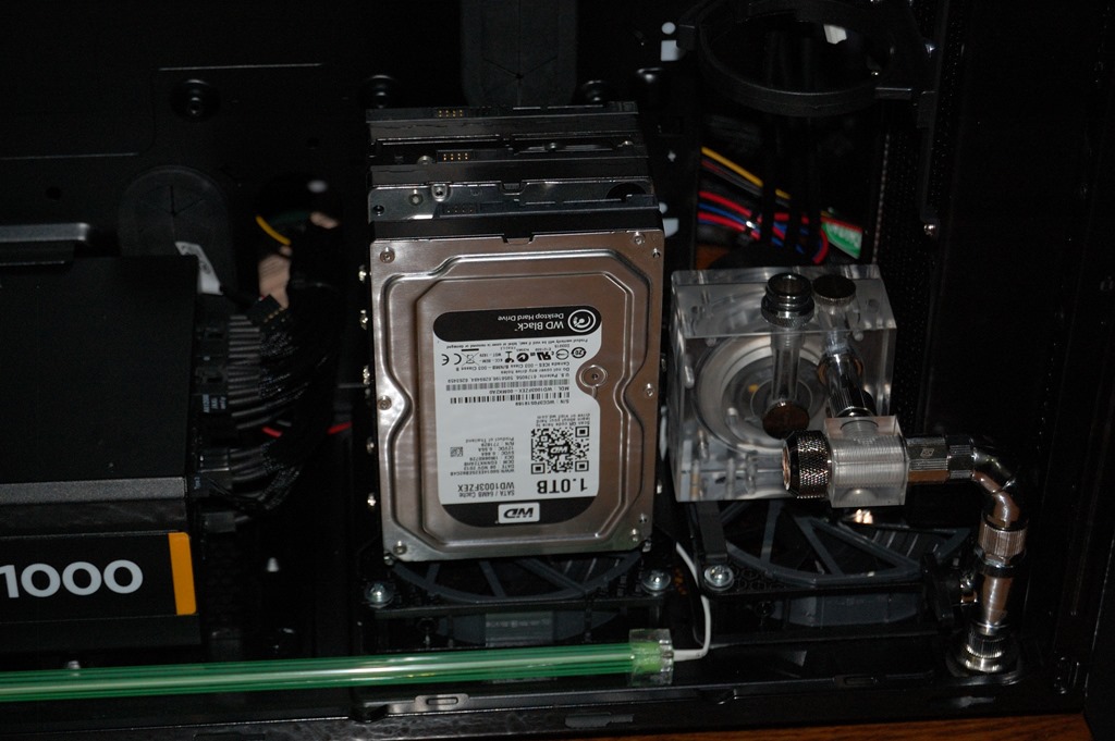 The hard drives were my first target. I needed to get those out and get the hard drive cage mounted in the case. If I didn’t do this early, it’d be difficult later on as the graphics cards were going to be close by, and the mainboard itself would also interfere a little. One thing I failed to anticipate with mounting the hard drives is that the hard drives would actually interfere slightly with the lower corner screw for the mainboard. It wasn’t impossible to reach, but it was a little blocked.