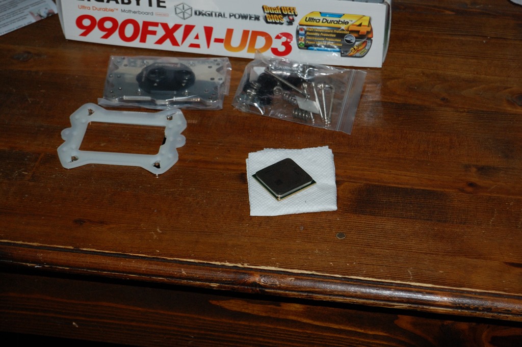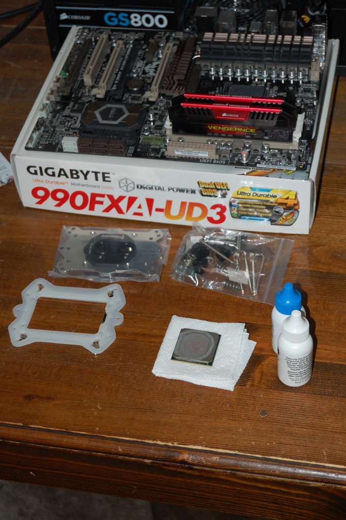 The block was relatively straightforward to install as well. The instructions were pretty easy to follow. And under the block I didn’t use Koolance’s included thermal compound, but my personal preference, IC Diamond. ArctiClean is the two white bottles next to the CPU with the old IC Diamond compound. Once the CPU was clean, it was a matter of installing it and the water block.