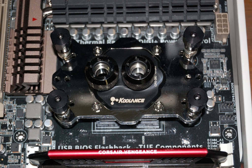 The Koolance block I new would be larger than the AlphaCool block. And it is also much heavier than the AlphaCool block. It’s probably the heaviest block on the market, now that I think about it, mainly because there is very little plastic in this. That is certainly a good thing. Plus the fitting threads are recessed into the block’s body, meaning if they crack there’s not really anywhere else for the coolant to go.