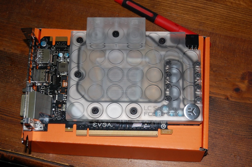 Of course ArctiClean was used to clean the stock thermal compound from the GPU. Then it was a matter of lining up the block to the card and screwing it down into place. I described how I did this originally in the original build log. For the SLI bridge, I misplaced the screws that were supposed to go with it. Thankfully Home Depot carried M4 screws with the right sized heads to fit inside the recessed mounting hole. For those curious, the instructions call out 25mm screws.