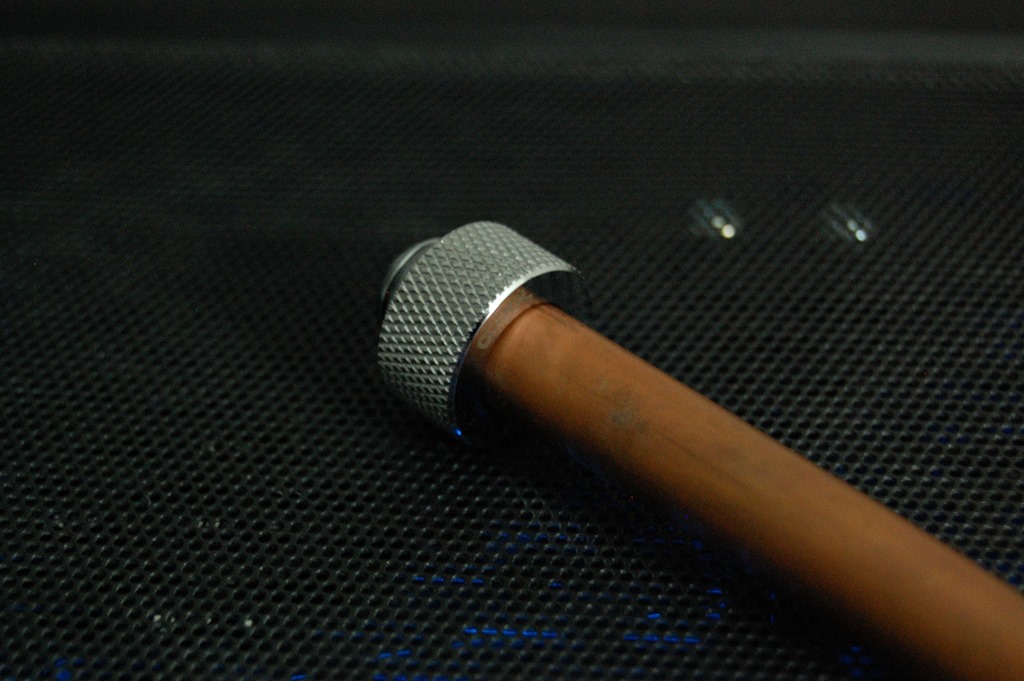 When I learned that AlphaCool was getting into the hardline business, I was intrigued. They have introduced the least expensive fittings I’ve seen so far, called the AlphaCool HT, which stands for HardTube. Currently they’re only available in black and chrome, and I ordered a pair of the chrome ones to try them out to see how well they’d fit with copper tubing. They’re listed for 13mm OD tubing, and 1/2″ is 12.7mm, so I presumed they’d fit, but wanted a pair to be sure.