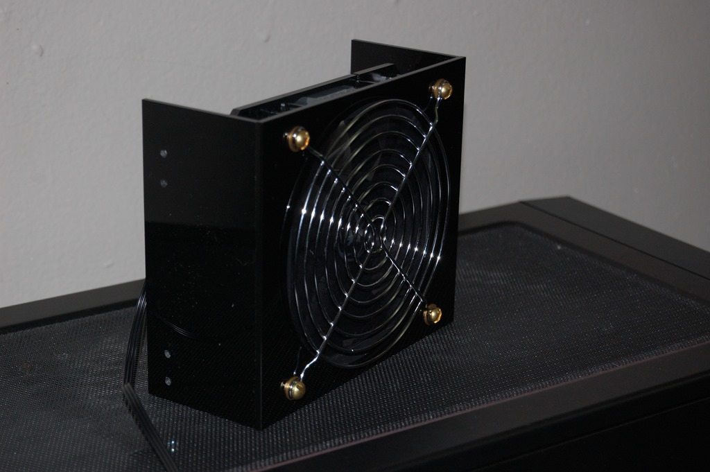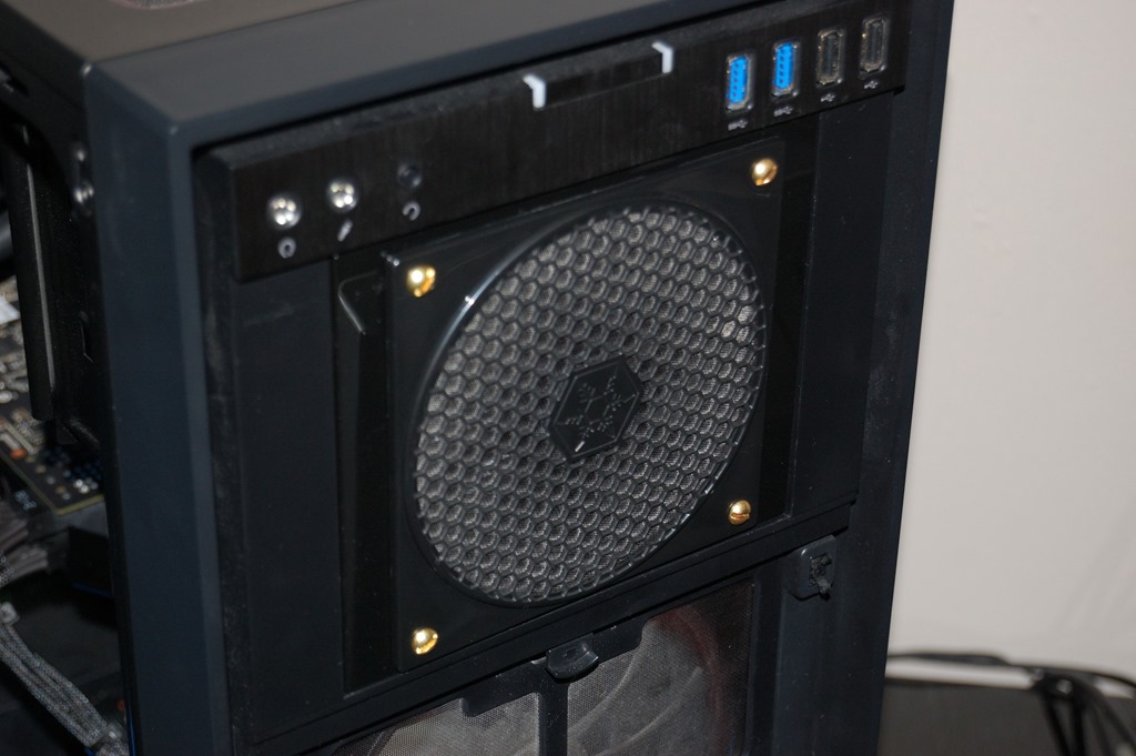 This is bracket from Mountain Mods that allows you to mount a 120mm fan into 3 x 5 1/4″ drive bays. This one is made of acrylic, though a metal one is also available. The fan is a Bitfenix Spectre Pro 120mm I ordered, and there’s a Silverstone FF123 filter between it and the grill. Unfortunately this doesn’t fit directly into the drive bay courtesy of the support “fins” for the optical drives, but a Dremel took care of that and allowed me to get it in.