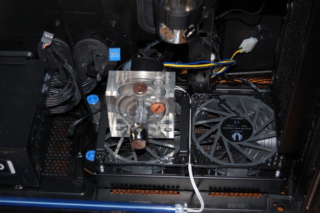 Another option that I briefly entertained is mounting the reservoir to the back of the rear 140mm fan outside the case. I also considered mounting it to the rear 140mm fan, but inside the case. The complication there is it could interfere with the fans on the top radiator, which would make it difficult to fill the reservoir for bleeding the system. Plus the initial tubing to get to the pump would cross in front of everything else.