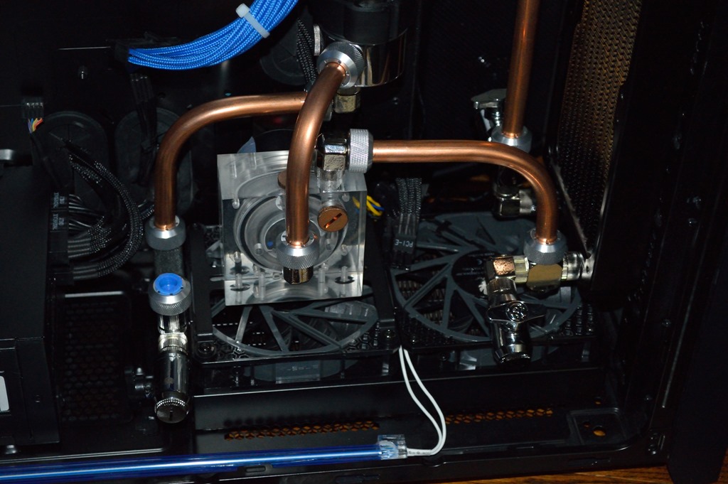Now the drain on the front radiator on this side of the case had to be changed. The 90-degree fitting I originally had used to take the flow off the front radiator put the fittings too high for the radius of the tubing bender. So I took it off the 90-degree fitting and changed it to what you see. It’s a male-to-male rotary fitting into the 4-way block. The drain valve is on the 90-degree fitting I originally used so it’s pointing out to the side like the drain on the bottom radiator to the left of the pump.