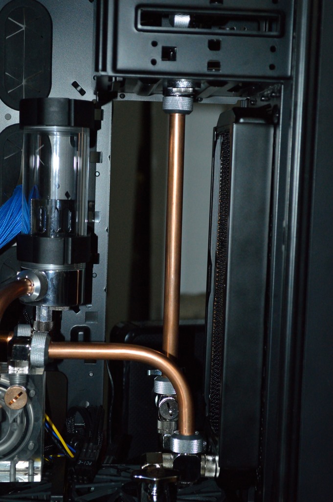 And it works like a charm. It won’t get the tubing perfectly straight, but it gets it pretty close, about as straight as I could get the tubing with the bench vice-vice grips-mallet method, but without the noise and associated pain in my hand. I was able to start pulling and bending copper tubing to get part of the loop built. Now this is about the furthest I can make progress before having to tear apart everything out of the Zalman case and start moving everything over, something I’ve been eagerly anticipating for the last couple months – the first article on this build was a little over two months ago. That move will likely be more toward the weekend.