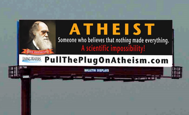 To clarify this billboard, setting aside for a moment that creationists believe that everything came from nothing, albeit with God’s assistance, atheists don’t believe “nothing made everything”. Instead we believe that the current state of the universe is the result of numerous natural processes. If you go to the website advertised, you’ll see banners similar to this billboard.