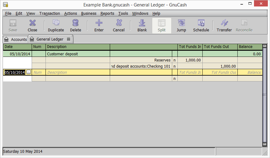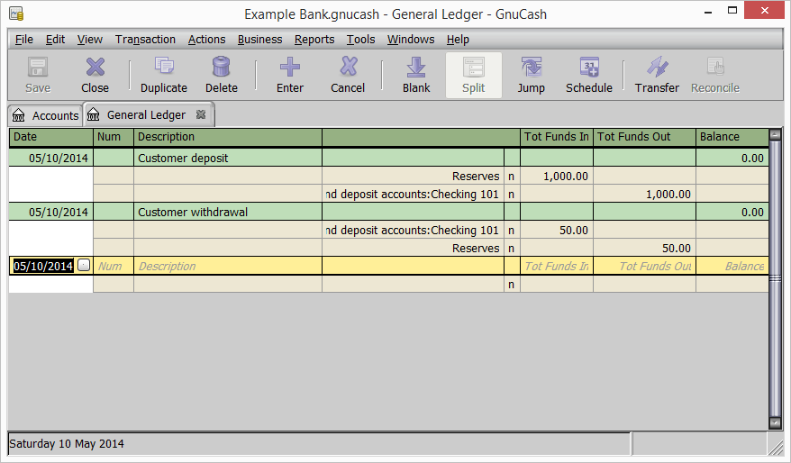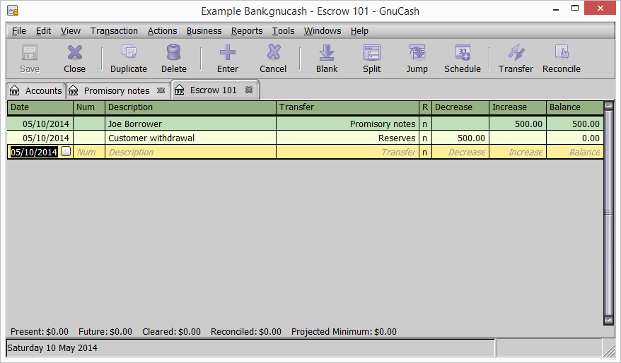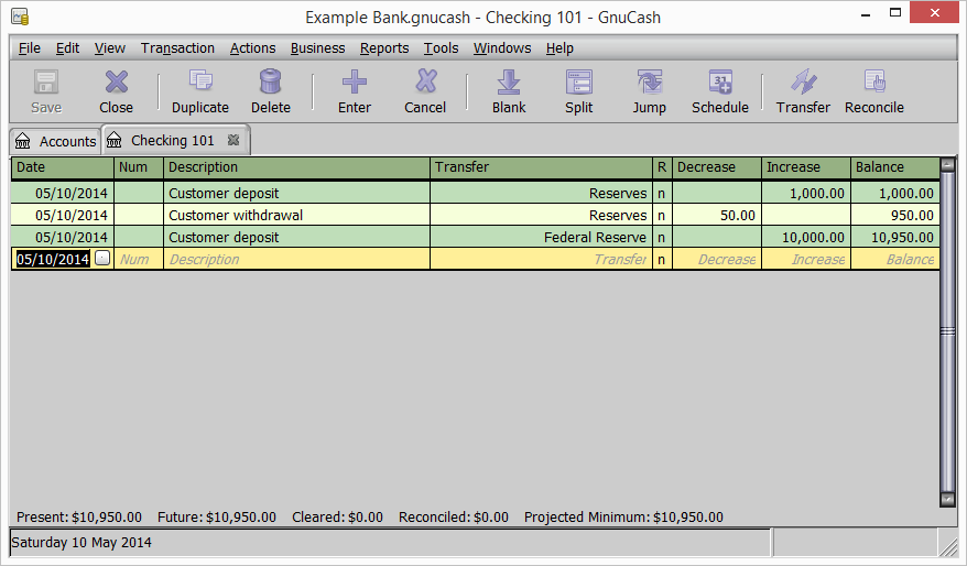 Now the total amount a bank can lend out is dependent upon what is called a reserve requirement, which for most banks in the US is 10%. On the banks books, the balance of the Notes Receivable account plus the balance of the Reserves must be no more than 10x the balance of the reserves. Few banks will get to that level, though, simply because of the risk involved. Remember our example bank still has a liability of $950, but only $450 in reserves backing it. If they loan out too much, they risk becoming insolvent.