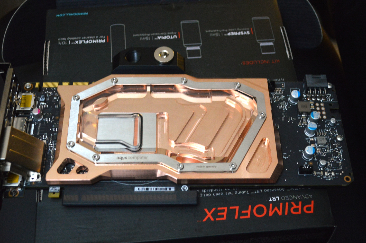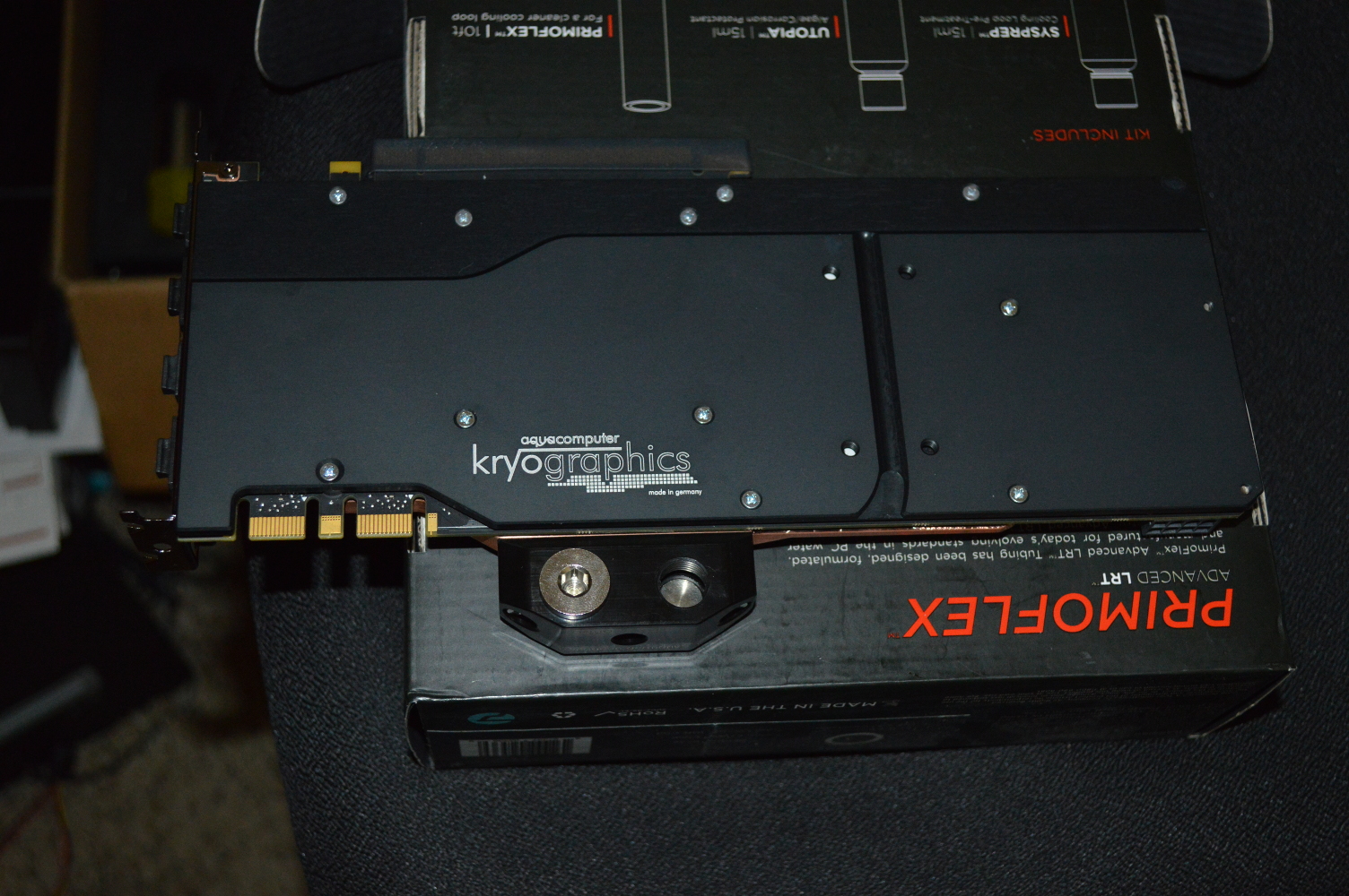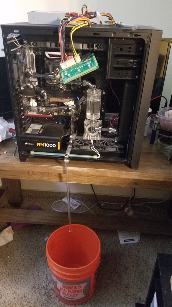 Once it was drained it was a matter of swapping out the cards and bleeding the loop. Unfortunately I did have to make some tubing modifications — the fittings aren’t in exactly the same place as on the R9 290X, but it wasn’t much. But unfortunately bleeding the loop didn’t go as planned and one of the tubing actually popped out of one of the fittings, first spraying, then pouring the coolant out.
