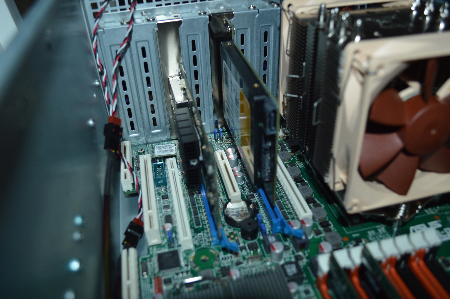 Initially I had the cards in the blue PCI-E slots on the mainboard, with the 10GbE card in the slot nearest the processors. The system wouldn’t POST doing this, and would only keep resetting when initializing the network card. So I swapped them around and put the SATA card nearest the CPUs.