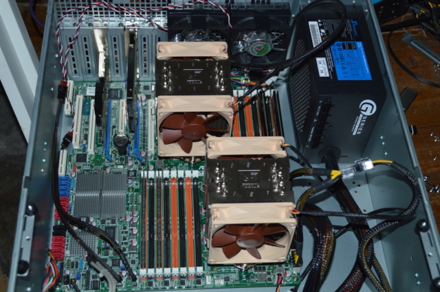 The Dynatron options were intriguing at first, mainly because of their price, but I was concerned with noise. So I decided to spring for the Noctua cooler, specifically the NH-U9DO A3, ordering through QuietPC. The NH-U12DO FAQ says to not use it in a 4U chassis unless you can guarantee clearance.