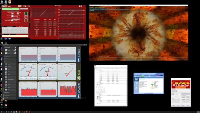 Running OCCT on “CPU: OCCT”, Test mode: “Small Data Set” with Furmark in the background at 1080p windowed, it took about 30 minutes for the coolant to reach equilibrium with the fan curves I had set, topping out a little north of 32.6°C (about 90.7°F) at the radiator inlet, a little under 31.5°C (about 88.7°F) at the radiator outlet (coolant going back to the reservoir), with the radiator fans at about 836rpm. (Note: the time showed on the OCCT test is after I had to restart it after an error).