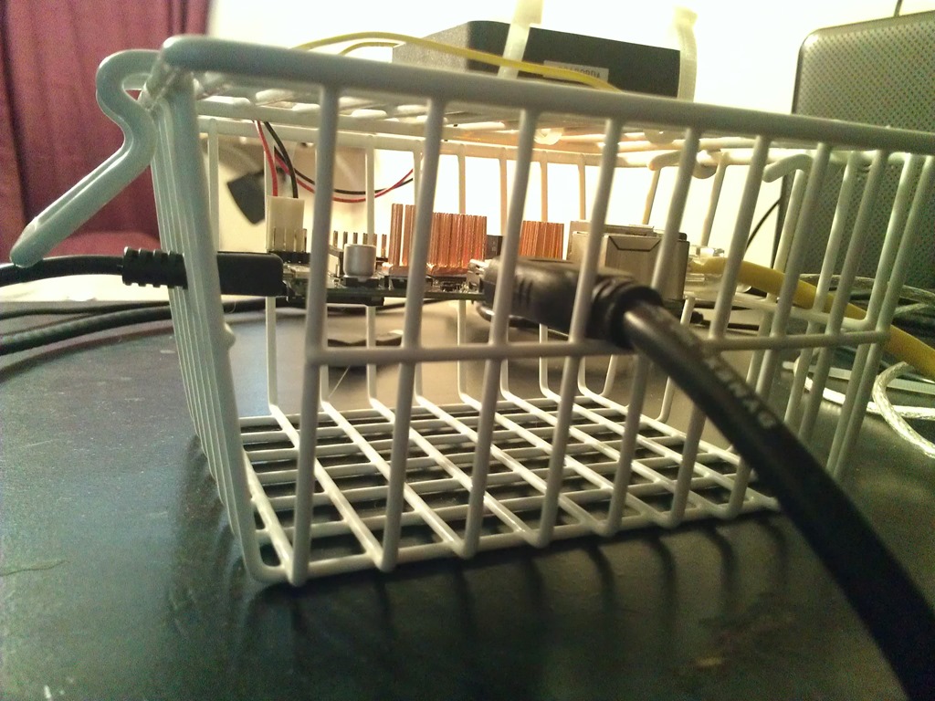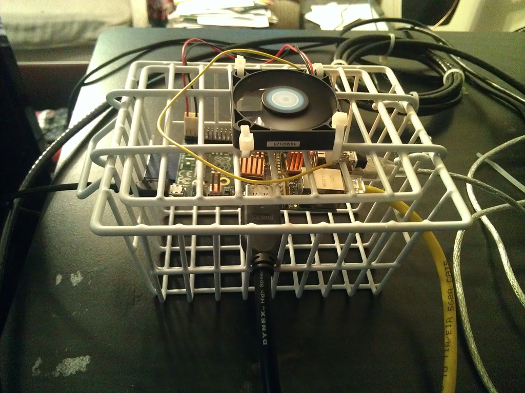 But then, how to mount the board so the fan was overhead… Unfortunately an enclosure I had purchased wouldn’t suffice for this. But I did have a dishwasher cage sitting around and some spare zip ties. The cables for the Pi could fit through the wire of the cage, and I used the zip ties to tie the fan over the board. Yeah it looks strange, but it gets the job done and gave me a proof of concept. And courtesy of how the cage is constructed, I could actually use the cables to suspend the Pi in the middle of the cage…