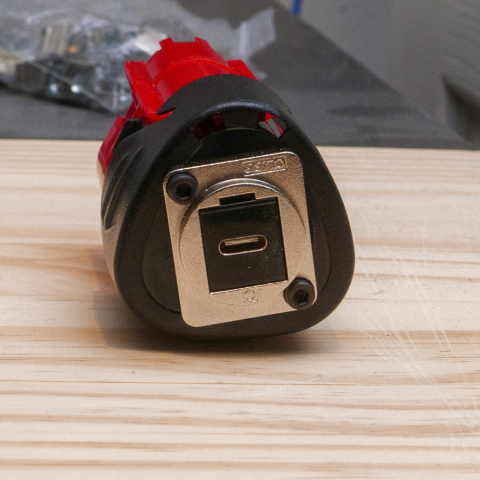 Once the hole is drilled out and cleaned, the panel mount plug should fit, though it’ll be a loose fit. I followed up with a drill and M3 tap for using M3x6mm screws.